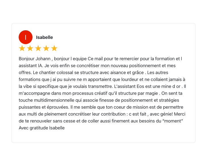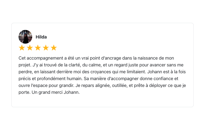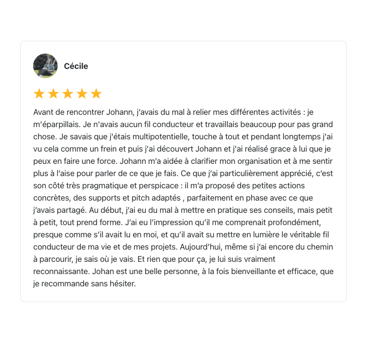 « Je ne me suis pas trompée en investissant sur ton accompagnement et ton talent pour m’aider à évoluer. Tu m’as beaucoup apporté, tant sur le plan business que sur le plan humain. Et justement, tu m’as aidé à faire la paix avec l’argent, à trouver un équilibre et une fluidité vis à vis de la valeur de mes compétences. Tu es rare et talentueux et je me sens chanceuse de t’avoir eu à mes côtés. Merci à toi pour tout ! »